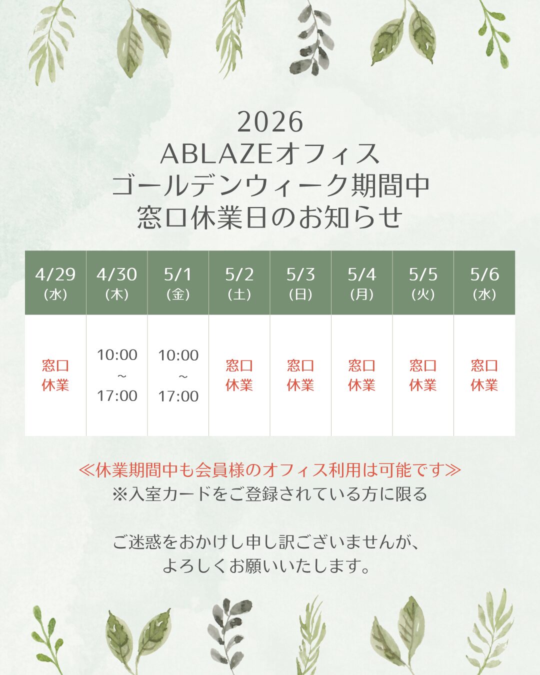 いつもABLAZEオフィスをご利用頂きありがとうございます。